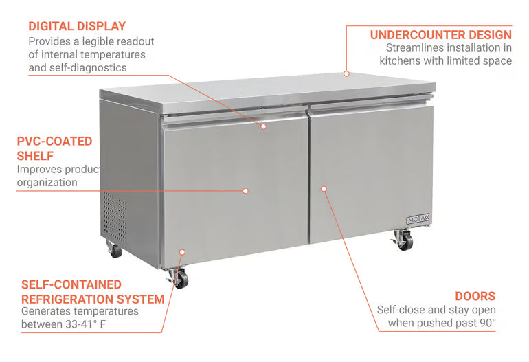 MoTak 60″ Commercial Undercounter Refrigerator – 2 Door Stainless Steel, NSF